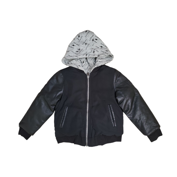 Taille: 116 cm. Manches en similicuir. Doublure en coton avec capuche fixe integré. La veste est réversible.